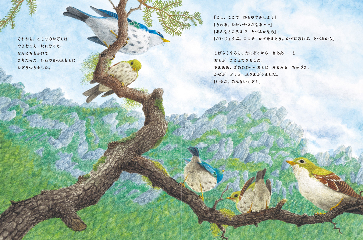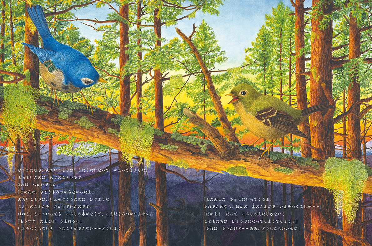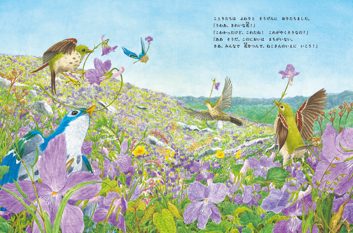 ことりは ねこから いちにち いっほんずつ、こえだを わけてもらい…。